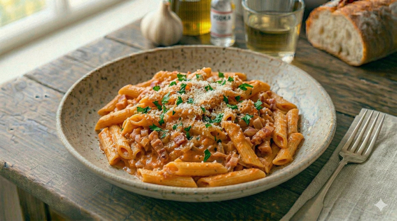Le Penne alla Vodka erano il piatto iconico degli anni '80 (famose per la loro cremosità rosata), ma qui le rendiamo "attuali" sostituendo il classico peperoncino in polvere con la Sriracha. La Sriracha è una salsa tailandese a base di peperoncino fermentato, aglio e aceto che dà alla crema di latte una nota acida e pungente che spacca!