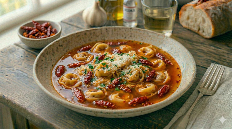 Questa non è la classica ricetta della nonna emiliana (che probabilmente griderebbe al sacrilegio), ma è il comfort food definitivo per quando sei raffreddato o hai bisogno di una sferzata di energia. Il brodo bollente trasporta il calore del peperoncino direttamente nei polmoni, mentre il ripieno grasso del tortellino placa l'incendio sulla lingua.